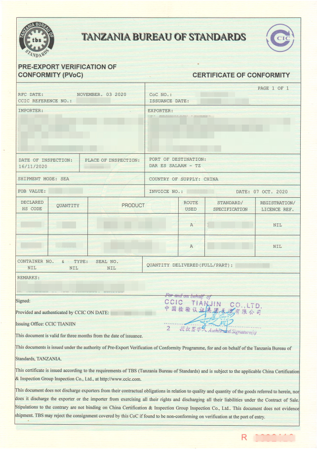 坦桑尼亚国家标准局(TBS)实施和执行的符合性评估程序(PVOC),从2012年2月1日起实施产品符合性认证COC,英文名称:Certificate of Conformity,属于装船前检验。